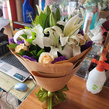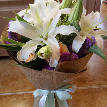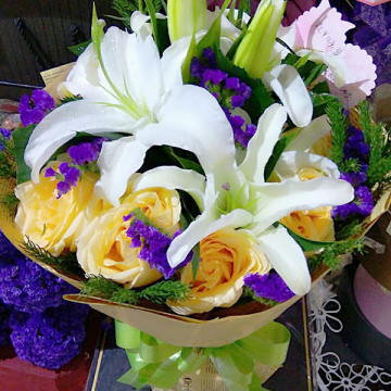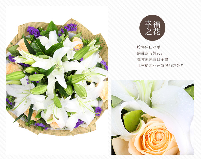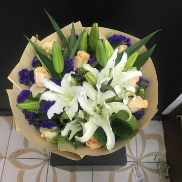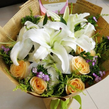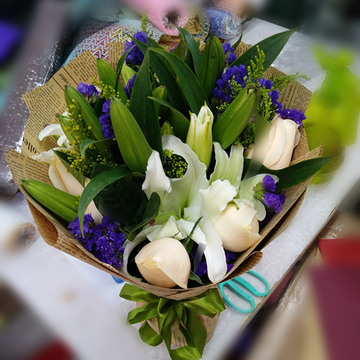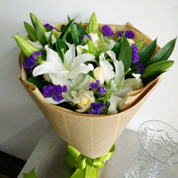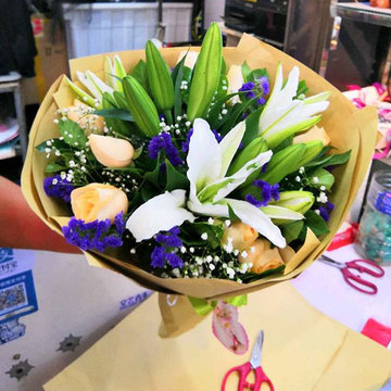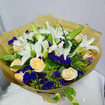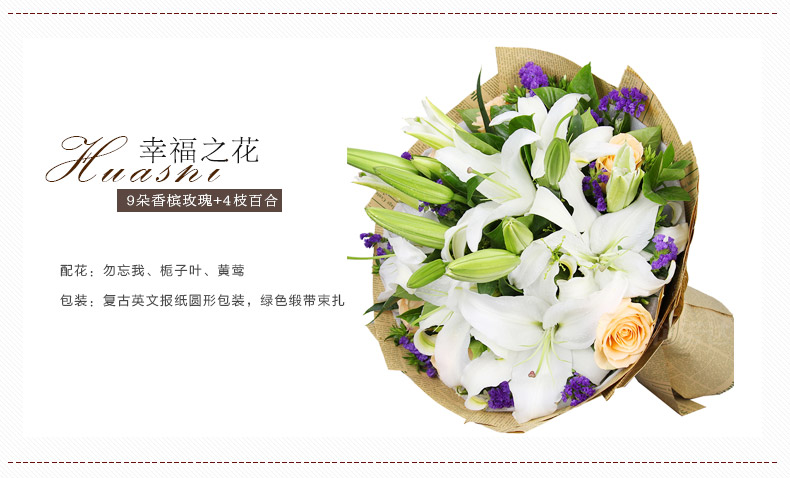 • 花材9朵香槟玫瑰+4枝百合搭配,勿忘我、栀子叶、黄莺点缀